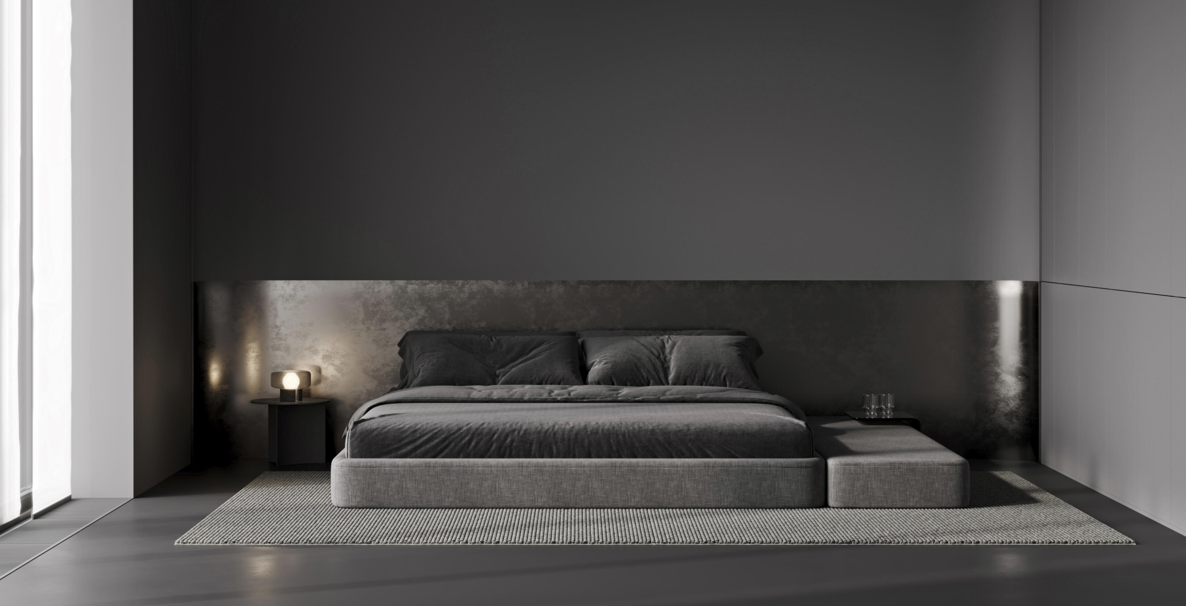A study in shadow and metallic depth, where the bed is anchored by a seamless expanse of darkened steel. This sanctuary of muted greys and obsidian linens invites a profound stillness, balanced by the ethereal filtration of light through translucent drapery.